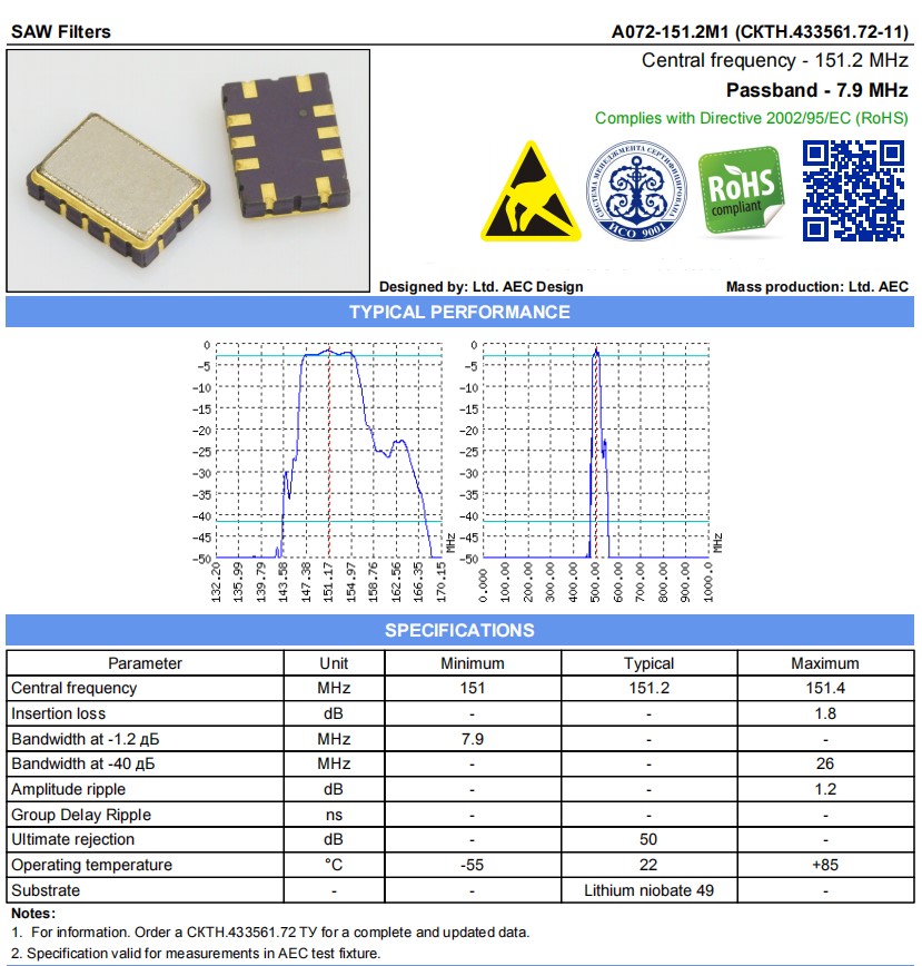 AEK安克晶體諧振器,A072-151.2M1,6G藍牙模塊晶振,SAW濾波器,7050mm貼片晶振,參數表