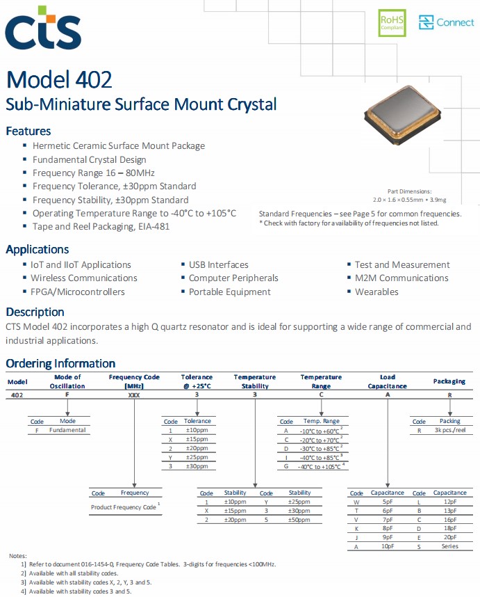 | 402F4001XIAR | CTS Crystal | 402 | MHz Crystal | 40MHz | 4-SMD, No Lead |