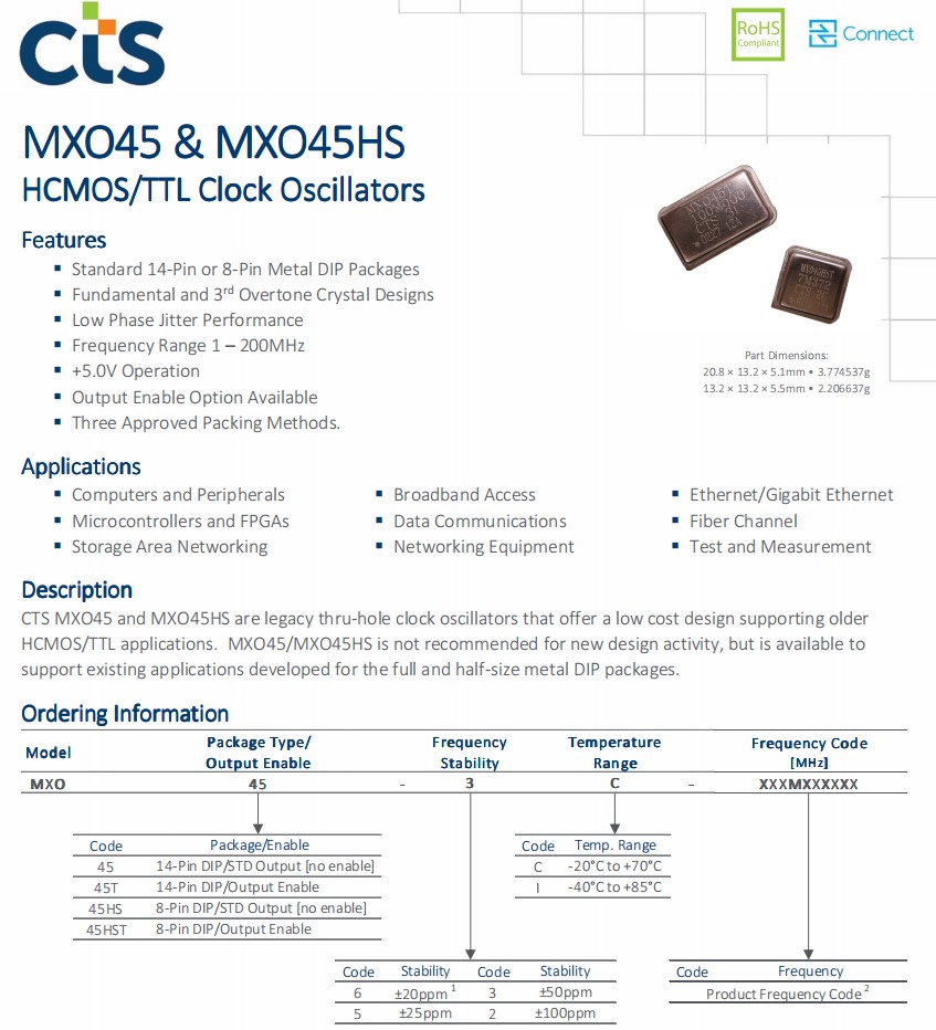 | MXO45-3C-12M0000 | CTS晶振 | MXO45 | 12MHz | ±50ppm | 14-DIP, 石英晶振 |