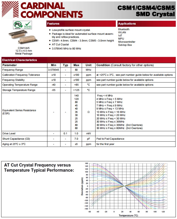 CSM4Z-A2B3C3-40-26.0D18-F,Cardinal晶體諧振器,26MHz,物聯網晶振,參數表
