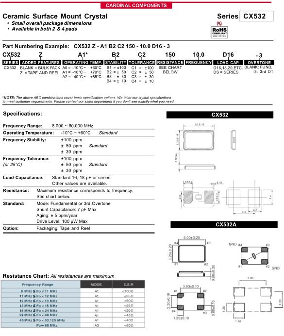 Mode: Fundamental or 3rd Overtone Shunt Capacitance: 7 pF Max Aging: ± 5 ppm/year Drive Level: 100 µW Max |