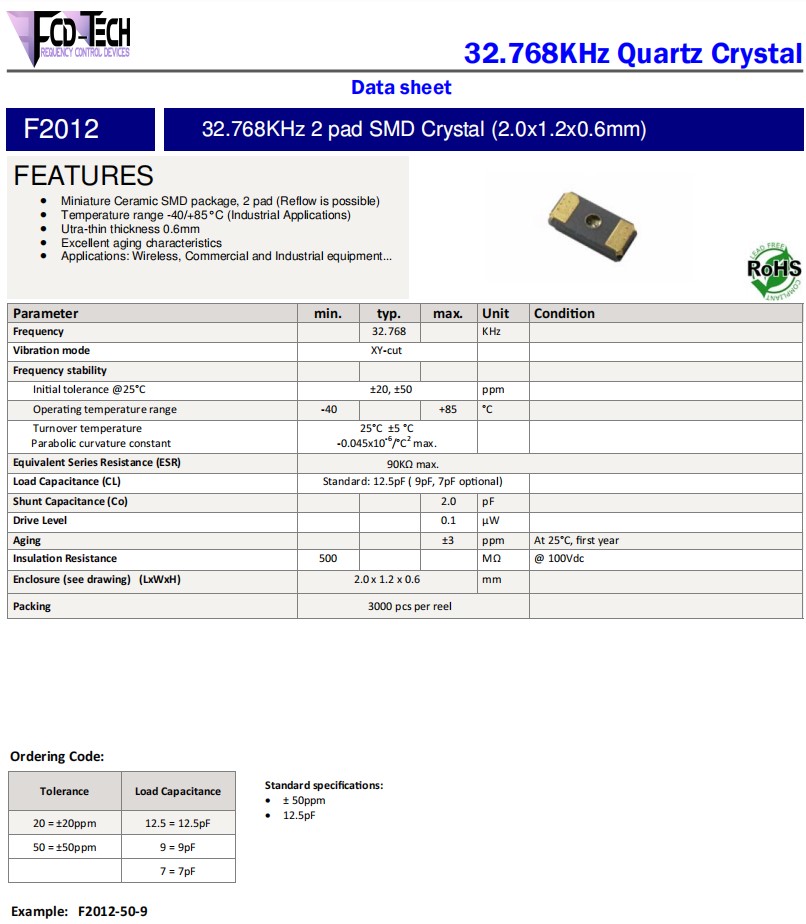 F2012‐50‐7,32.768KHz,2012mm,FCD-Tech無源晶振,F2012,計(jì)時(shí)器應(yīng)用晶振,參數(shù)表