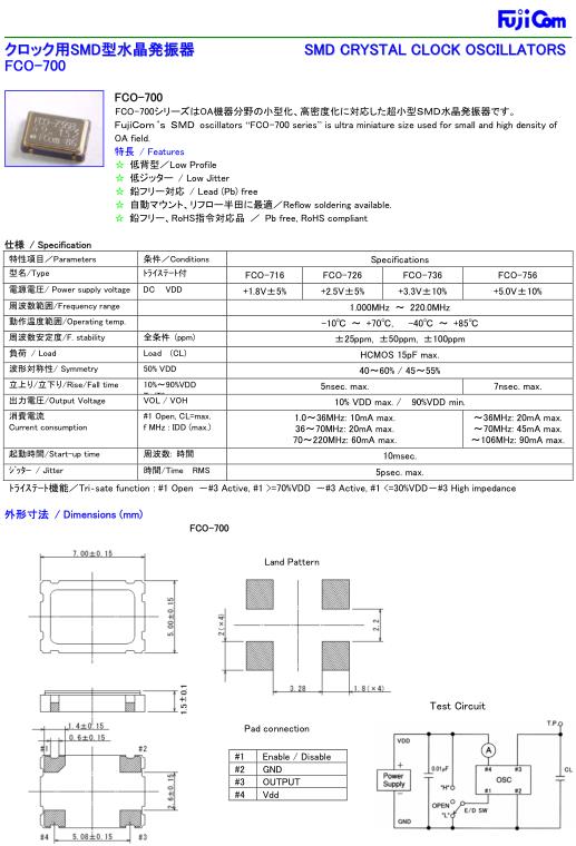 Fujicom晶振,FCO-726晶振,SMD時鐘振蕩器,小型SMD有源晶振,從最初超大體積到現在的7050mm,6035mm,5032mm,3225mm,2520mm體積,有著翻天覆地的改變,體積的變小也使產品帶來了更高的穩定性能,接縫密封石英晶體振蕩器,精度高,覆蓋頻率范圍寬的特點,SMD高速自動安裝和高溫回流焊設計,Optionable待機輸出三態輸出功能,電源電壓范圍:1.8V~5V,高穩定性,低抖動,低功耗,主要應用領域:無線通訊,高端智能手機,平板筆記本WLAN,藍牙,數碼相機,DSL和其他IT產品的晶振應用,三態功能,PC和LCDM等高端數碼領域,符合RoHS/無鉛.