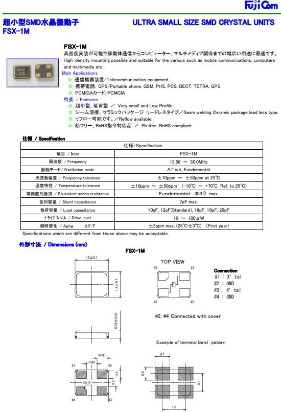 Fujicom晶振,FSX-1M晶振,SMD水晶振動子,貼片晶振本身體積小,超薄型石英晶體振蕩器,特別適用于有目前高速發展的高端電子數碼產品,因為晶振本身小型化需求的市場領域,小型,薄型是對應陶瓷振蕩器(偏差大)和普通的石英晶體振蕩器(偏差小)的中間領域的一種性價比較出色的產品.產品廣泛用于筆記本電腦,無線電話,衛星導航SSD,USB,Blu-ray等用途,符合無鉛焊接的高溫回流焊曲線特性.