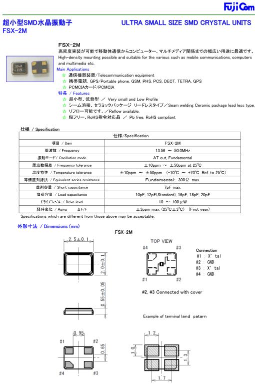 Fujicom晶振,FSX-2M晶振,2520mm無源晶振,小型貼片石英晶振,外觀尺寸具有薄型表面貼片型石英晶體振蕩器,特別適用于有小型化要求的市場領(lǐng)域,比如智能手機(jī),無線藍(lán)牙,平板電腦等電子數(shù)碼產(chǎn)品.晶振本身超小型,薄型,重量輕,晶體具有優(yōu)良的耐環(huán)境特性,如耐熱性,耐沖擊性,在辦公自動(dòng)化,家電相關(guān)電器領(lǐng)域及Bluetooth,WirelessLAN等短距離無線通信領(lǐng)域可發(fā)揮優(yōu)良的電氣特性,滿足無鉛焊接的回流溫度曲線要求.