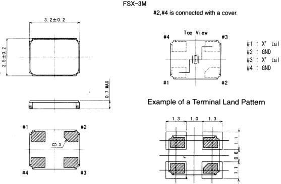 在一個不同擴張系數電路板(環氧玻璃)上焊接陶瓷封裝石英晶振時,在溫度長時間重復變化時可能導致端子焊接部分發生斷裂,請事先檢查焊接特性。Fujicom晶振,FSX-3M晶振,四腳貼片晶振.