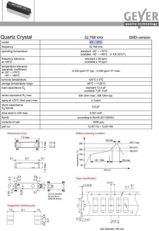 Geyer晶振,KX-327L晶振,石英晶體,貼片表晶32.768K系列具有超小型,薄型,質地輕的表面貼片音叉型石英晶體振蕩器,晶振產品本身具備優良的耐熱性,耐環境特性,在辦公自動化,家電領域,移動通信領域可發揮優良的電氣特性,符合無鉛標準,滿足無鉛焊接的回流溫度曲線要求,金屬外殼的石英晶振使得產品在封裝時能發揮比陶瓷晶振外殼更好的耐沖擊性能..