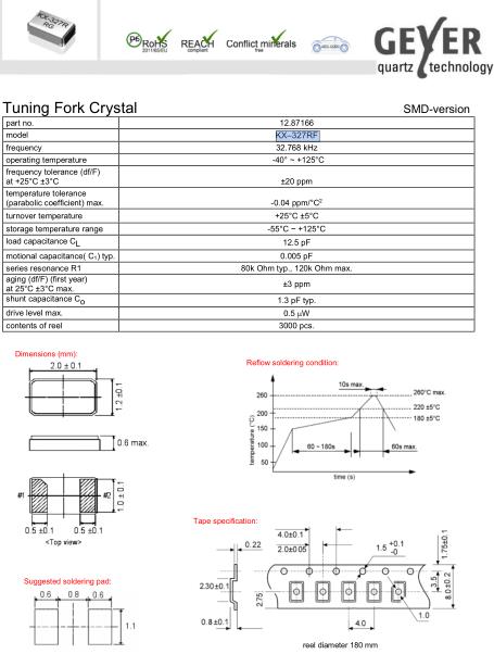 Geyer晶振,KX-327VT晶振,32.768KHZ晶振,32.768K時鐘晶體具有小型,薄型,輕型的貼片晶振表面音叉型晶體振蕩器,產(chǎn)品具有優(yōu)良的耐熱性,耐環(huán)境特性,可發(fā)揮晶振優(yōu)良的電氣特性,符合RoHS規(guī)定,滿足無鉛焊接的高溫回流溫度曲線要求,金屬外殼的封裝使得產(chǎn)品在封裝時能發(fā)揮比陶瓷振蕩器外殼更好的耐沖擊性.