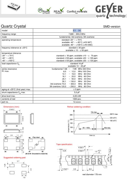 fundamental 7,68 ~ 7,99 MHz 330 Ohm 8,0 ~ 12,0 MHz 100 Ohm 12,1 ~ 16,0 MHz 80 Ohm 16,1 ~ 20,0 MHz 60 Ohm 20,1 ~ 50,0 MHz 40 Ohm 50,1 ~ 130,0 MHz 30 Ohm 3rd overtone 70,0 ~ 300,0 MHz 80 Ohm 5th overtone 120,0 ~ 250,0 MHz 80 Ohm |