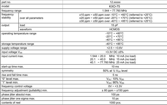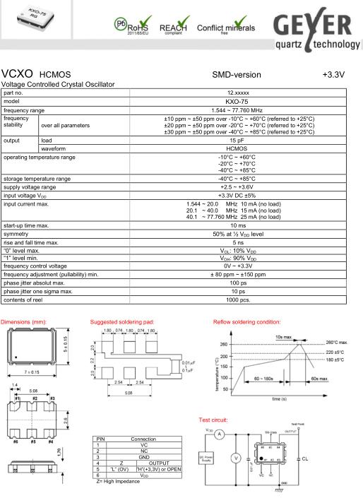 Geyer晶振,KXO-75晶振,壓控晶體振蕩器,壓控晶振(VCXO),壓控石英晶體振蕩器基本解決方案,PECL輸出,輸出頻率60MHz到200MHz之間,出色的低相位噪聲和抖動,三態功能,應用:SDH/SONET,以太網,基站,筆記本晶振應用,符合RoHS/無鉛.
