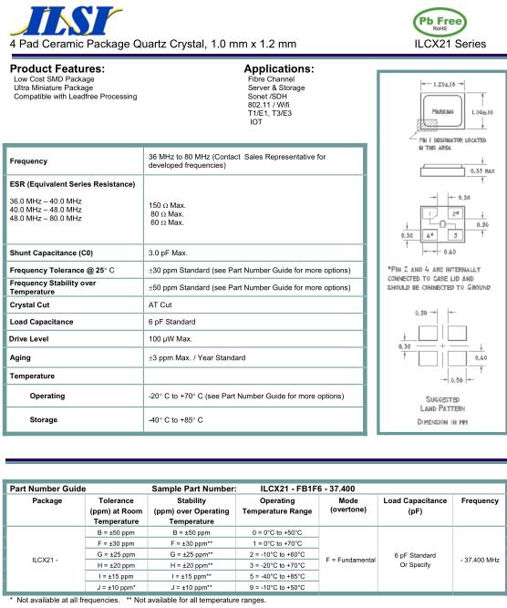 ILSI晶振,ILCX21晶振,ILCX21-FB1F6-37.400晶振,貼片晶振本身體積小,超薄型石英晶體振蕩器,特別適用于有目前高速發展的高端電子數碼產品,因為晶振本身小型化需求的市場領域,小型,薄型是對應陶瓷振蕩器(偏差大)和普通的石英晶體振蕩器(偏差小)的中間領域的一種性價比較出色的產品.產品廣泛用于筆記本電腦,無線電話,衛星導航SSD,USB,Blu-ray等用途,符合無鉛焊接的高溫回流焊曲線特性.