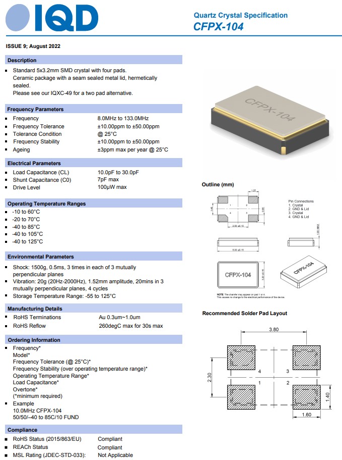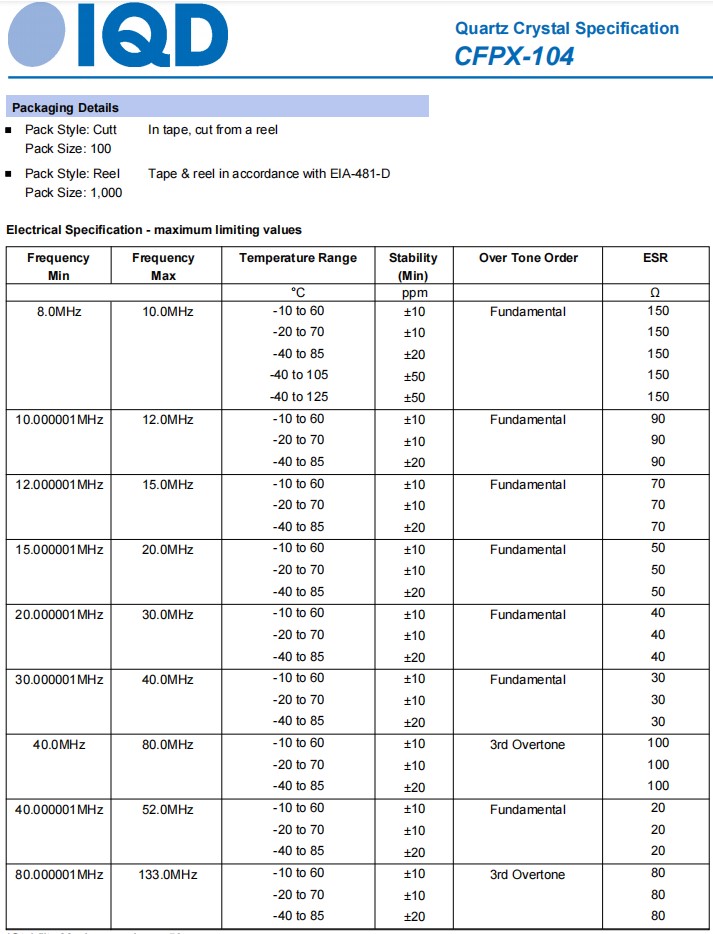 IQD伊克德石英晶體,CFPX-104,LFXTAL059528REEL,5032無源晶振,LFXTAL059531REEL,6G網絡晶振,參數表