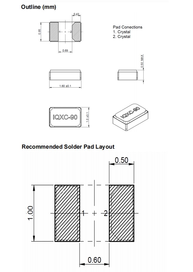 LFXTAL082140,1610mm,32.768KHz,IQD兩腳貼片晶振,IQXC-90,音叉晶體,尺寸圖