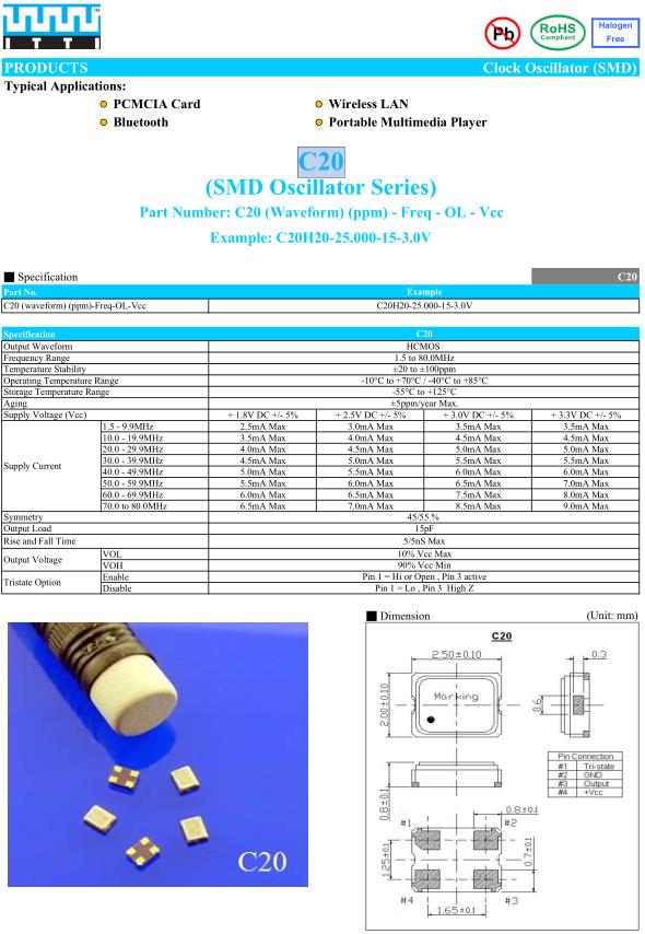 ITTI晶振,C20晶振,C20H20-20.000-15-3.0V晶振,有源晶振,是指晶體本身起振需要外部電壓供應(yīng),起振后可直接驅(qū)動(dòng)CMOS集成電路,產(chǎn)品本身已實(shí)現(xiàn)與薄型IC(TSSOP封裝,TVSOP封裝)同樣的1mm厚度,斷開時(shí)的消費(fèi)電流是15µA以下,編帶包裝方式可對(duì)應(yīng)自動(dòng)搭載及IR回流焊接(無(wú)鉛對(duì)應(yīng))產(chǎn)品有幾種電壓供選1.8V,2.5V,3V3.3V,5V,以應(yīng)對(duì)不同IC產(chǎn)品需要.