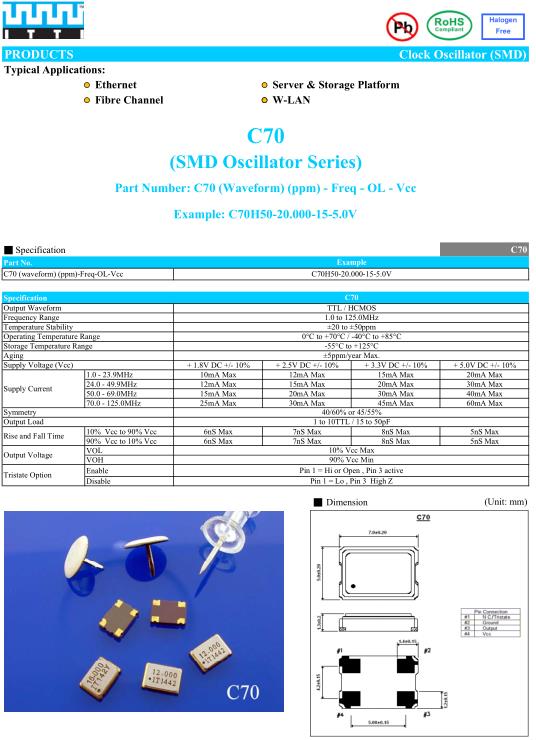 ITTI晶振,C70晶振,C70H50-20.000-15-5.0V晶振,小型SMD有源晶振,從最初超大體積到現(xiàn)在的7050mm,6035mm,5032mm,3225mm,2520mm體積,有著翻天覆地的改變,體積的變小也使產(chǎn)品帶來了更高的穩(wěn)定性能,接縫密封石英晶體振蕩器,精度高,覆蓋頻率范圍寬的特點(diǎn),SMD高速自動(dòng)安裝和高溫回流焊設(shè)計(jì),Optionable待機(jī)輸出三態(tài)輸出功能,電源電壓范圍:1.8V~5V,高穩(wěn)定性,低抖動(dòng),低功耗,主要應(yīng)用領(lǐng)域:無線通訊,高端智能手機(jī),平板筆記本W(wǎng)LAN,藍(lán)牙,數(shù)碼相機(jī),DSL和其他IT產(chǎn)品的晶振應(yīng)用,三態(tài)功能,PC和LCDM等高端數(shù)碼領(lǐng)域,符合RoHS/無鉛.