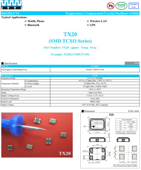 ITTI晶振,TX20晶振,TX202.5-3085-24.000晶振,有源晶振,是指晶體本身起振需要外部電壓供應,起振后可直接驅動CMOS集成電路,產品本身已實現(xiàn)與薄型IC(TSSOP封裝,TVSOP封裝)同樣的1mm厚度,斷開時的消費電流是15µA以下,編帶包裝方式可對應自動搭載及IR回流焊接(無鉛對應)產品有幾種電壓供選1.8V,2.5V,3V3.3V,5V,以應對不同IC產品需要.