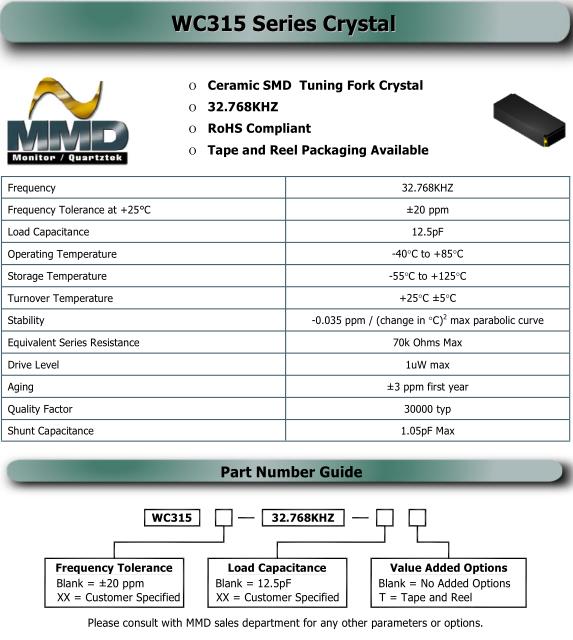 MMDCOMP晶振是美國一家全面服務(wù)的頻率元器件制造商.自公司成立以來MMDCOMP晶振便已成為一家服務(wù)型技術(shù)公司,致力于向市場提供石英晶體,溫補(bǔ)晶振,壓控晶振等元件.麥迪康晶振,WC315晶振,WC315-XX-32.768KHZ-XXT晶振.