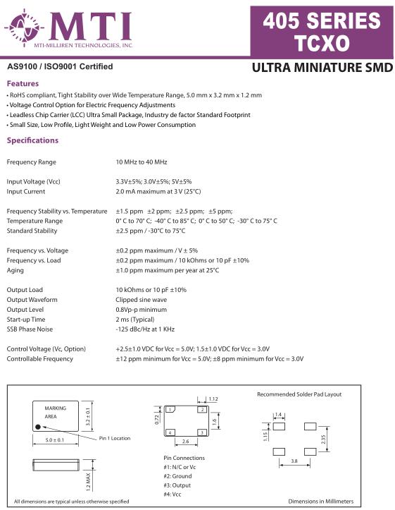 MTI晶振,405晶振,5032mm晶振,5032mm體積的石英晶體振蕩器,有源晶振,該產品可驅動2.5V的溫補晶振,壓控晶振,VC-TCXO晶體振蕩器產品,電源電壓的低電耗型,編帶包裝方式,可對應自動高速貼片機自動焊接,及IR回流焊接(無鉛對應),為無鉛產品,超小型,質地輕.產品被廣泛應用到集成電路,程控交換系統,無線發射基站.
