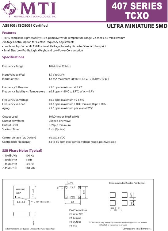 MTI Crystal可稱為米利倫晶振,擁有領先的制造技術和提供世界一流的客戶服務,專業(yè)提供MTI有源晶振,溫補晶振,貼片晶振等頻率元件,所有產(chǎn)品保證是高質(zhì)量,精確和穩(wěn)定的頻率控制元器件,并以高品質(zhì),高性能的產(chǎn)品得到市場的認可,使得MTI晶振聞名于天下.米利倫晶振,407晶振,2520mm有源晶振.