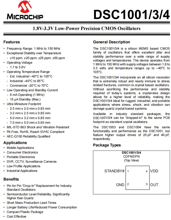 | DSC1004DI2-072.0000T | Microchip晶振 | DSC1004 | 72MHz | 1.8 ~ 3.3V |