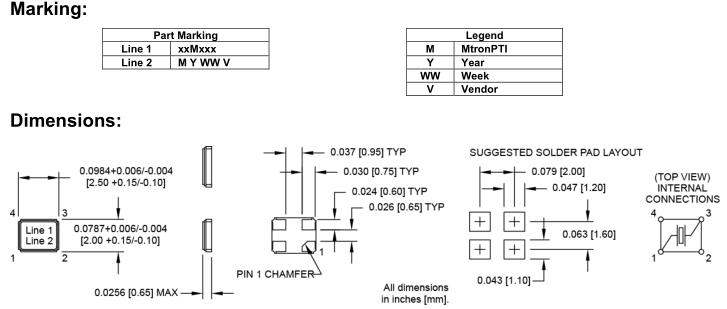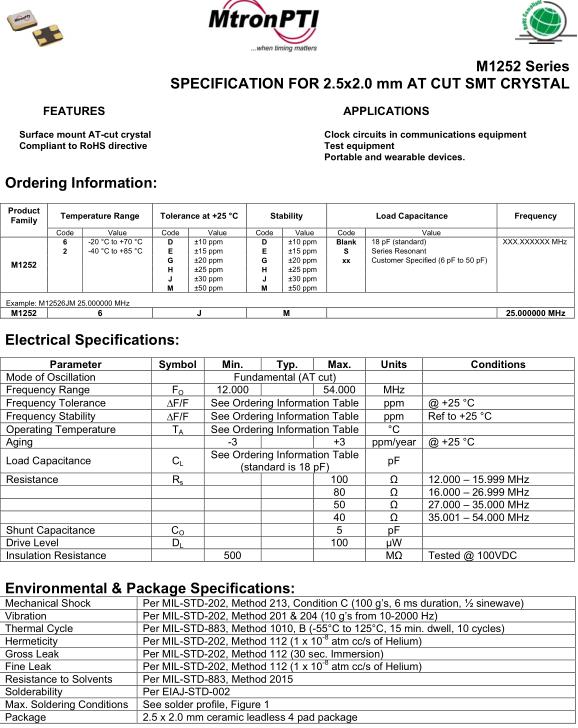 MtronPTI晶振,M1252晶振,M12526JM24.000000MHz晶振,小型貼片石英晶振,外觀尺寸具有薄型表面貼片型石英晶體振蕩器,特別適用于有小型化要求的市場領域,比如智能手機,無線藍牙,平板電腦等電子數碼產品.晶振本身超小型,薄型,重量輕,晶體具有優良的耐環境特性,如耐熱性,耐沖擊性,在辦公自動化,家電相關電器領域及Bluetooth,WirelessLAN等短距離無線通信領域可發揮優良的電氣特性,滿足無鉛焊接的回流溫度曲線要求.