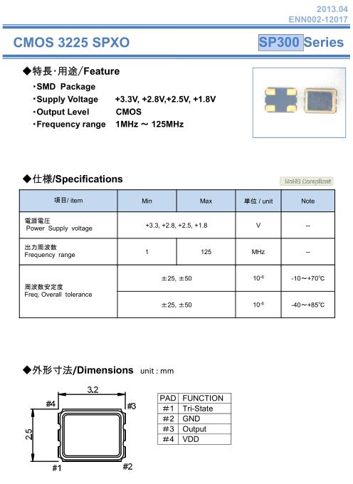 NAKA晶振,SP300晶振,SPXO普通有源晶振,小型SMD有源晶振,從最初超大體積到現(xiàn)在的7050mm,6035mm,5032mm,3225mm,2520mm體積,有著翻天覆地的改變,體積的變小也使產(chǎn)品帶來了更高的穩(wěn)定性能,接縫密封石英晶體振蕩器,精度高,覆蓋頻率范圍寬的特點(diǎn),SMD高速自動(dòng)安裝和高溫回流焊設(shè)計(jì),Optionable待機(jī)輸出三態(tài)輸出功能,電源電壓范圍:1.8V~5V,高穩(wěn)定性,低抖動(dòng),低功耗,主要應(yīng)用領(lǐng)域:無線通訊,高端智能手機(jī),平板筆記本W(wǎng)LAN,藍(lán)牙,數(shù)碼相機(jī),DSL和其他IT產(chǎn)品的晶振應(yīng)用,三態(tài)功能,PC和LCDM等高端數(shù)碼領(lǐng)域,符合RoHS/無鉛.