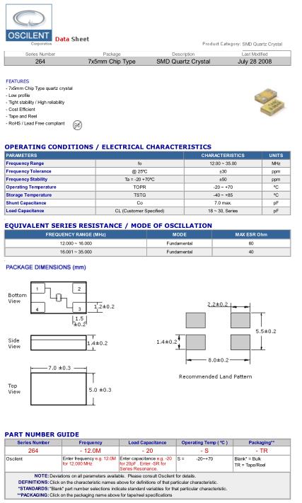 Oscilent晶振,264-12.0M-20-S-TR晶振,高性能晶振,貼片晶振本身體積小,超薄型石英晶體振蕩器,特別適用于有目前高速發(fā)展的高端電子數(shù)碼產(chǎn)品,因為晶振本身小型化需求的市場領(lǐng)域,小型,薄型是對應(yīng)陶瓷振蕩器(偏差大)和普通的石英晶體振蕩器(偏差小)的中間領(lǐng)域的一種性價比較出色的產(chǎn)品.產(chǎn)品廣泛用于筆記本電腦,無線電話,衛(wèi)星導(dǎo)航SSD,USB,Blu-ray等用途,符合無鉛焊接的高溫回流焊曲線特性.