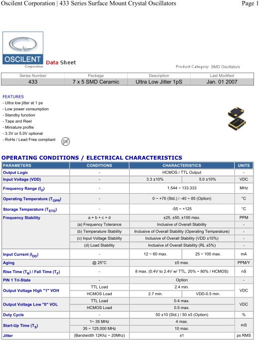 Oscilent晶振,433-24.0M-3EN-TTS晶振,進口有源晶振,小型SMD有源晶振,從最初超大體積到現在的7050mm,6035mm,5032mm,3225mm,2520mm體積,有著翻天覆地的改變,體積的變小也使產品帶來了更高的穩定性能,接縫密封石英晶體振蕩器,精度高,覆蓋頻率范圍寬的特點,SMD高速自動安裝和高溫回流焊設計,Optionable待機輸出三態輸出功能,電源電壓范圍:1.8V~5V,高穩定性,低抖動,低功耗,主要應用領域:無線通訊,高端智能手機,平板筆記本WLAN,藍牙,數碼相機,DSL和其他IT產品的晶振應用,三態功能,PC和LCDM等高端數碼領域,符合RoHS/無鉛.