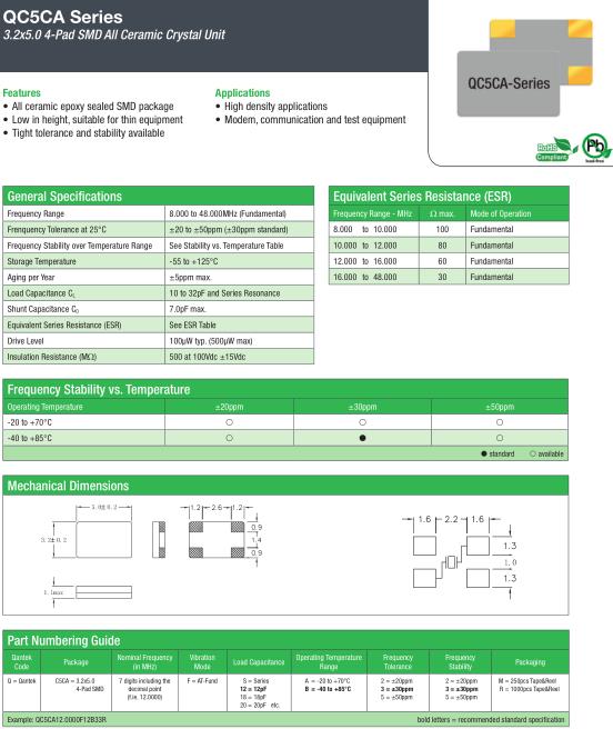 QANTEK晶振,QC5CA晶振,QC5CA16.0000F12B33R晶振,智能手機(jī)晶振,產(chǎn)品具有高精度超小型的表面貼片型石英晶體振蕩器,最適用于移動(dòng)通信終端的基準(zhǔn)時(shí)鐘等移動(dòng)通信領(lǐng)域.比如智能手機(jī),無(wú)線通信,衛(wèi)星導(dǎo)航,平臺(tái)基站等較高端的數(shù)碼產(chǎn)品,晶振本身小型,薄型具備各類移動(dòng)通信的基準(zhǔn)時(shí)鐘源用頻率,貼片晶振具有優(yōu)良的電氣特性,耐環(huán)境性能適用于移動(dòng)通信領(lǐng)域,滿足無(wú)鉛焊接的高溫回流溫度曲線要求.