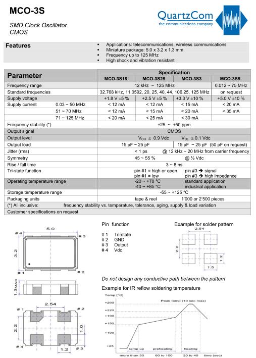 QuartzCom晶振,MCO-3S18晶振,時鐘振蕩器,5032mm體積的石英晶體振蕩器,有源晶振,該產品可驅動2.5V的溫補晶振,壓控晶振,VC-TCXO晶體振蕩器產品,電源電壓的低電耗型,編帶包裝方式,可對應自動高速貼片機自動焊接,及IR回流焊接(無鉛對應),為無鉛產品,超小型,質地輕.產品被廣泛應用到集成電路,程控交換系統,無線發射基站.