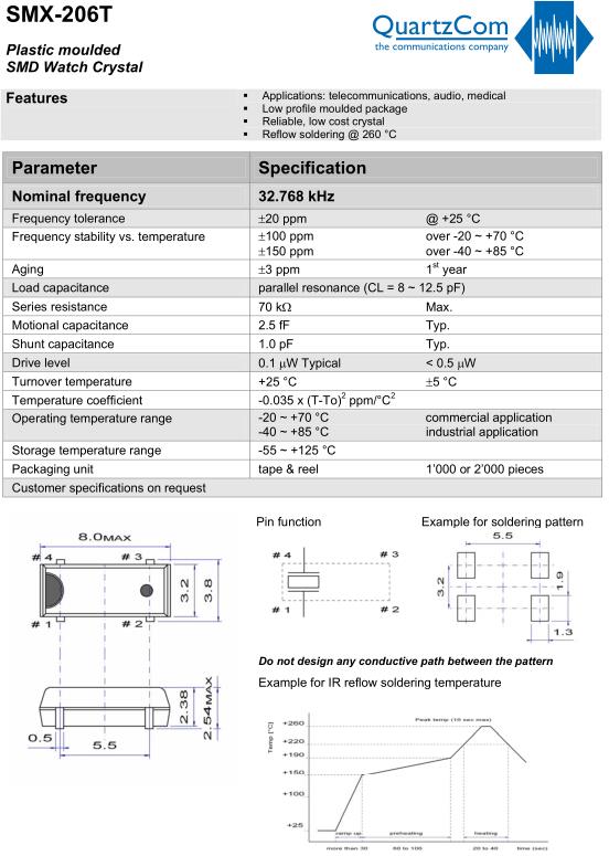 QuartzCom晶振,SMX-206T晶振,8038mm晶振,32.768K時鐘晶體具有小型,薄型,輕型的貼片晶振表面音叉型晶體振蕩器,產品具有優良的耐熱性,耐環境特性,可發揮晶振優良的電氣特性,符合RoHS規定,滿足無鉛焊接的高溫回流溫度曲線要求,金屬外殼的封裝使得產品在封裝時能發揮比陶瓷振蕩器外殼更好的耐沖擊性.