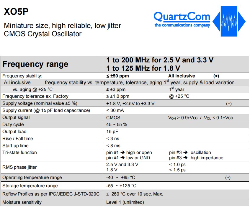 XO5P-H33-NN1u25-156.250MHz,5032mm,QuartzCom石英通晶振,XO5P,石英晶體振蕩器,參數表