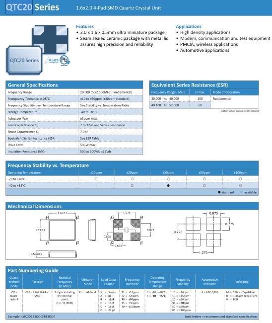Quarztechnik晶振,QTC20晶振,QTC2012.0000FBT3I30R晶振,貼片晶振本身體積小,超薄型石英晶體振蕩器,特別適用于有目前高速發(fā)展的高端電子數(shù)碼產(chǎn)品,因?yàn)榫д癖旧硇⌒突枨蟮氖袌?chǎng)領(lǐng)域,小型,薄型是對(duì)應(yīng)陶瓷振蕩器(偏差大)和普通的石英晶體振蕩器(偏差小)的中間領(lǐng)域的一種性價(jià)比較出色的產(chǎn)品.產(chǎn)品廣泛用于筆記本電腦,無(wú)線電話,衛(wèi)星導(dǎo)航SSD,USB,Blu-ray等用途,符合無(wú)鉛焊接的高溫回流焊曲線特性.