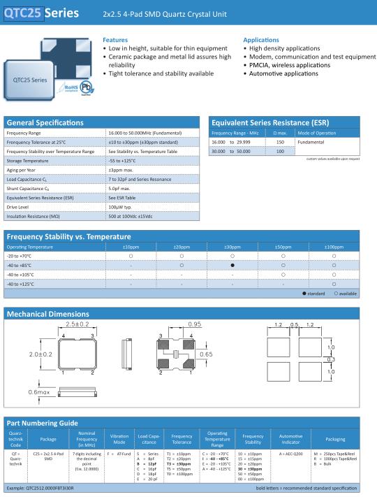 德國(guó)Quarztechnik Crystal(夸克晶振)公司成立已有50多年的歷史,在石英晶體振蕩器制造方面具有頗深的造詣.除此之外Quarztechnik晶振不僅生產(chǎn)晶體還研發(fā)生產(chǎn)溫補(bǔ)晶振,OSC晶振,有源晶振等元件,并做到價(jià)格低廉,性能優(yōu)越.同時(shí)擁有龐大的生產(chǎn)力以及快速交付的能力.夸克晶振,QTC25晶振,QTC2512.0000FBT3I30R晶振.