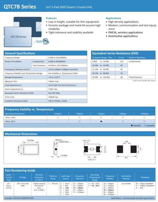 Quarztechnik晶振,QTC7B晶振,QTC7B12.0000FBT3I30R晶振,貼片晶振本身體積小,超薄型石英晶體振蕩器,特別適用于有目前高速發(fā)展的高端電子數碼產品,因為晶振本身小型化需求的市場領域,小型,薄型是對應陶瓷振蕩器(偏差大)和普通的石英晶體振蕩器(偏差小)的中間領域的一種性價比較出色的產品.產品廣泛用于筆記本電腦,無線電話,衛(wèi)星導航SSD,USB,Blu-ray等用途,符合無鉛焊接的高溫回流焊曲線特性.