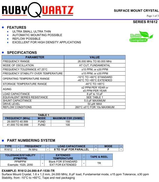 Rubyquartz晶振,R1612晶振,R1612-24.000-8-F-1530-TR晶振,貼片晶振本身體積小,超薄型石英晶體振蕩器,特別適用于有目前高速發(fā)展的高端電子數(shù)碼產(chǎn)品,因為晶振本身小型化需求的市場領(lǐng)域,小型,薄型是對應(yīng)陶瓷振蕩器(偏差大)和普通的石英晶體振蕩器(偏差小)的中間領(lǐng)域的一種性價比較出色的產(chǎn)品.產(chǎn)品廣泛用于筆記本電腦,無線電話,衛(wèi)星導(dǎo)航SSD,USB,Blu-ray等用途,符合無鉛焊接的高溫回流焊曲線特性.