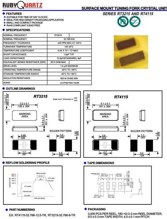 Rubyquartz晶振,RT3215晶振,RT3215-32.768-8-TR晶振,32.768K時鐘晶體具有小型,薄型,輕型的貼片晶振表面音叉型晶體振蕩器,產品具有優良的耐熱性,耐環境特性,可發揮晶振優良的電氣特性,符合RoHS規定,滿足無鉛焊接的高溫回流溫度曲線要求,金屬外殼的封裝使得產品在封裝時能發揮比陶瓷振蕩器外殼更好的耐沖擊性.
