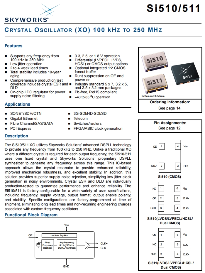 | 511FCA000292CAG | Skyworks有源晶振 | XTAL OSC XO 161.1328MHZ LVDS SMD | Si511 | 161.1328 MHz | LVDS | 2.5V |