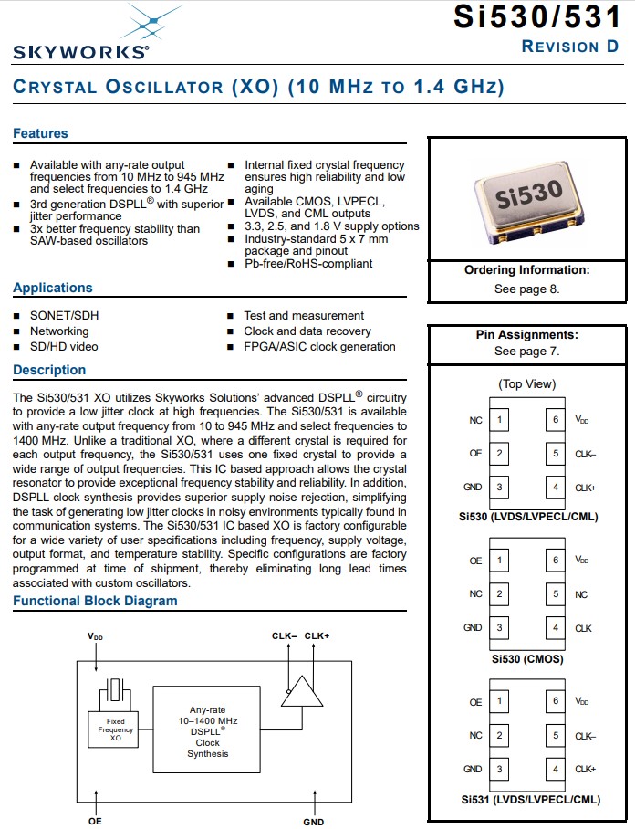 思佳訊LVPECL振蕩器,530EC125M000DG,Si530差分晶體振蕩器,Skyworks思佳訊晶振,進口晶振,型號:Si530,編碼為:530EC125M000DG,頻率為:125.000MHz,小體積晶振尺寸:7.0x5.0mm封裝,六腳貼片晶振,LVPECL差分晶體振蕩器,石英晶振,有源晶振,差分晶振,石英晶體振蕩器。具有超小型,輕薄型,低抖動,低功耗,低相位噪聲,低電源電壓,低電平,低耗能等特點。應用于:超聲波/SDH,網(wǎng)絡,SD/HD視頻,測試和測量,時鐘和數(shù)據(jù)恢復,F(xiàn)PGA/ASIC時鐘生成。