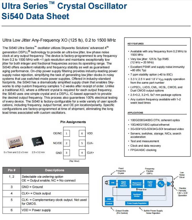 | 540BAC116M000BAGR | Skyworks晶振 | Si540 | 116 MHz | LVDS | 1.8V, 2.5V, 3.3V |