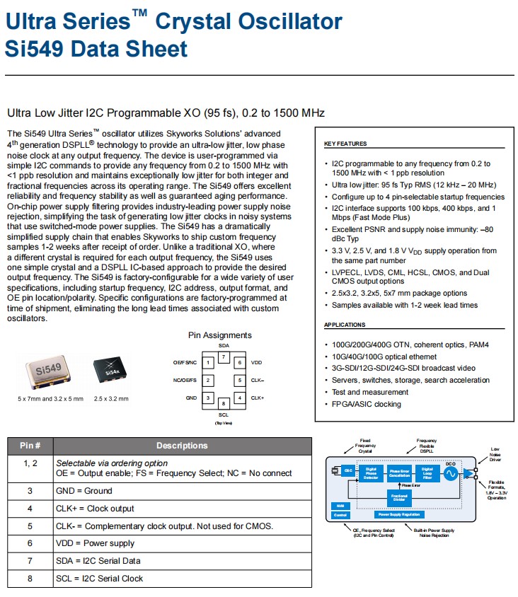 思佳訊LVPECL輸出振蕩器,549AAAA000118BCG,Si549無線網絡晶振,進口晶振,Skyworks思佳訊晶振,型號:Si549,編碼為:549AAAA000118BCG,頻率為:156.25 MHz,小體積晶振尺寸:5.0x3.2mm封裝,8墊腳貼片晶振,LVPECL差分晶振,石英晶振,有源晶振,石英晶體振蕩器。具有超小型,輕薄型,低抖動,低功耗,低相位噪聲,低電源電壓等特點。應用于:100G/200G/400G OTN,相干光學,PAM410G/40G/100G光學以太網,3G-SDI/12G-SDI/24G-SDI廣播視頻,服務器、交換機、存儲、搜索加速,測試和測量,FPGA/ASIC時鐘,物聯網,無線網絡,藍牙模塊等應用。