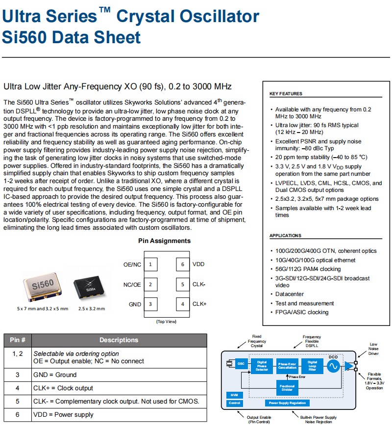 | 560BAC200M000BBG | Skyworks晶振 | Si560 | 200 MHz | LVDS | 1.8V, 2.5V, 3.3V |