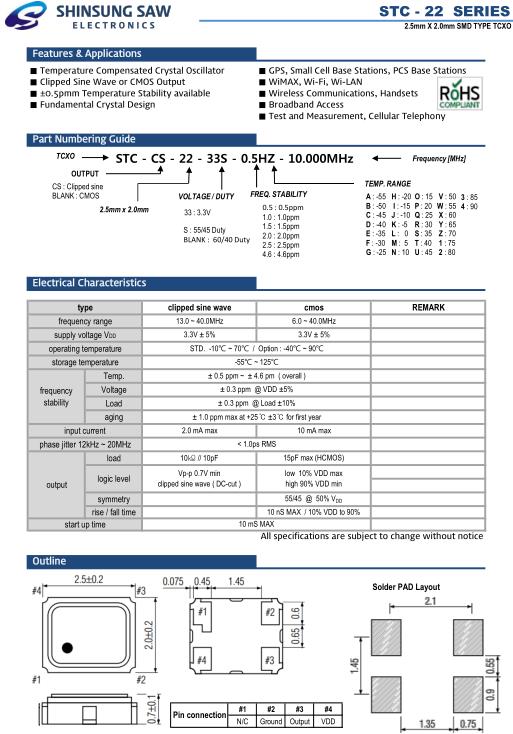 新松晶振,STC-22晶振,STC-CS-22-33S-0.5HZ-10.000MHz晶振,有源晶振,是指晶體本身起振需要外部電壓供應,起振后可直接驅動CMOS集成電路,產品本身已實現與薄型IC(TSSOP封裝,TVSOP封裝)同樣的1mm厚度,斷開時的消費電流是15µA以下,編帶包裝方式可對應自動搭載及IR回流焊接(無鉛對應)產品有幾種電壓供選1.8V,2.5V,3V3.3V,5V,以應對不同IC產品需要.