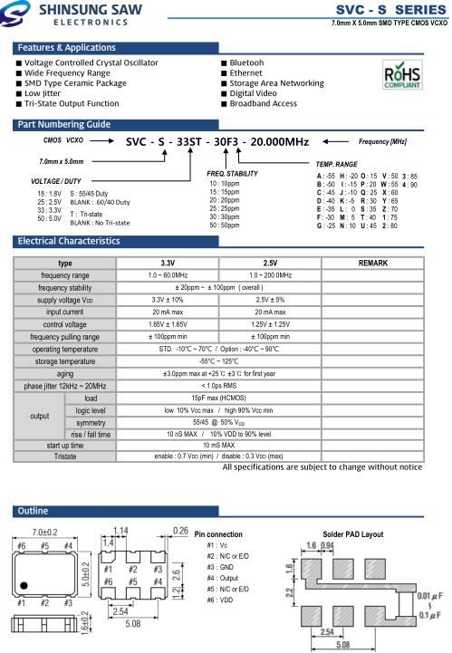 Shinsung晶振,SVC-S晶振,SVC-S-33ST-30F3-20.000MHz晶振,小型SMD有源晶振,從最初超大體積到現在的7050mm,6035mm,5032mm,3225mm,2520mm體積,有著翻天覆地的改變,體積的變小也使產品帶來了更高的穩定性能,接縫密封石英晶體振蕩器,精度高,覆蓋頻率范圍寬的特點,SMD高速自動安裝和高溫回流焊設計,Optionable待機輸出三態輸出功能,電源電壓范圍:1.8V~5V,高穩定性,低抖動,低功耗,主要應用領域:無線通訊,高端智能手機,平板筆記本WLAN,藍牙,數碼相機,DSL和其他IT產品的晶振應用,三態功能,PC和LCDM等高端數碼領域,符合RoHS/無鉛.