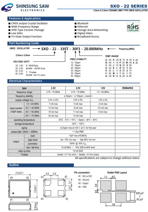Shinsung晶振,SXO-22晶振,SXO-22-33ST-30F3-20.000MHz晶振,有源晶振,是指晶體本身起振需要外部電壓供應,起振后可直接驅動CMOS集成電路,產品本身已實現(xiàn)與薄型IC(TSSOP封裝,TVSOP封裝)同樣的1mm厚度,斷開時的消費電流是15µA以下,編帶包裝方式可對應自動搭載及IR回流焊接(無鉛對應)產品有幾種電壓供選1.8V,2.5V,3V3.3V,5V,以應對不同IC產品需要.