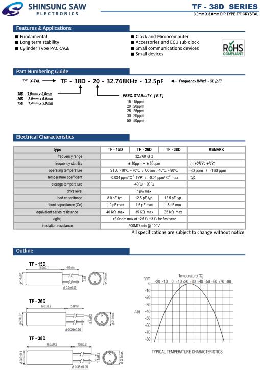 SHINSUNG Crysta成立于1990年,并開始生產石英晶振,濾波器,石英晶體振蕩器,向客戶提供最新的最新的新松貼片晶振或通孔型晶振單元,時鐘有源晶振,溫補晶振等晶振產品,一直以供應優質晶振產品為信念,不斷給社會創造價值.Shinsung晶振,TF-38D晶振,TF-38D-20-32.768KHz-10pF晶振..jpg)