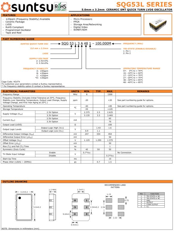 松圖晶振,SQG53L晶振,SQG53L3A481-16.000M晶振,5032mm體積的石英晶體振蕩器,有源晶振,該產(chǎn)品可驅動2.5V的溫補晶振,壓控晶振,VC-TCXO晶體振蕩器產(chǎn)品,電源電壓的低電耗型,編帶包裝方式,可對應自動高速貼片機自動焊接,及IR回流焊接(無鉛對應),為無鉛產(chǎn)品,超小型,質(zhì)地輕.產(chǎn)品被廣泛應用到集成電路,程控交換系統(tǒng),無線發(fā)射基站.