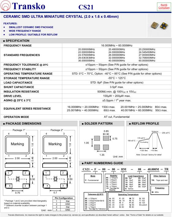 Transko晶振,CS21晶振,CS21F0000HM08-16.000-TR晶振,貼片晶振本身體積小,超薄型石英晶體振蕩器,特別適用于有目前高速發展的高端電子數碼產品,因為晶振本身小型化需求的市場領域,小型,薄型是對應陶瓷振蕩器(偏差大)和普通的石英晶體振蕩器(偏差小)的中間領域的一種性價比較出色的產品.產品廣泛用于筆記本電腦,無線電話,衛星導航SSD,USB,Blu-ray等用途,符合無鉛焊接的高溫回流焊曲線特性.
