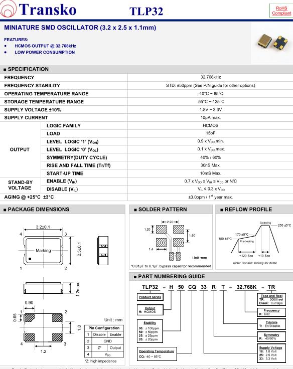 Transko晶振,TLP32晶振,TLP32-H50CQ33RT-32.768K-TR晶振,32.768K時(shí)鐘晶體具有小型,薄型,輕型的貼片晶振表面音叉型晶體振蕩器,產(chǎn)品具有優(yōu)良的耐熱性,耐環(huán)境特性,可發(fā)揮晶振優(yōu)良的電氣特性,符合RoHS規(guī)定,滿足無(wú)鉛焊接的高溫回流溫度曲線要求,金屬外殼的封裝使得產(chǎn)品在封裝時(shí)能發(fā)揮比陶瓷振蕩器外殼更好的耐沖擊性.