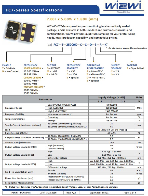威爾威7050mm晶振,FC7-T-C12000-P-D-D-2-R-X,低抖動晶振,參數表